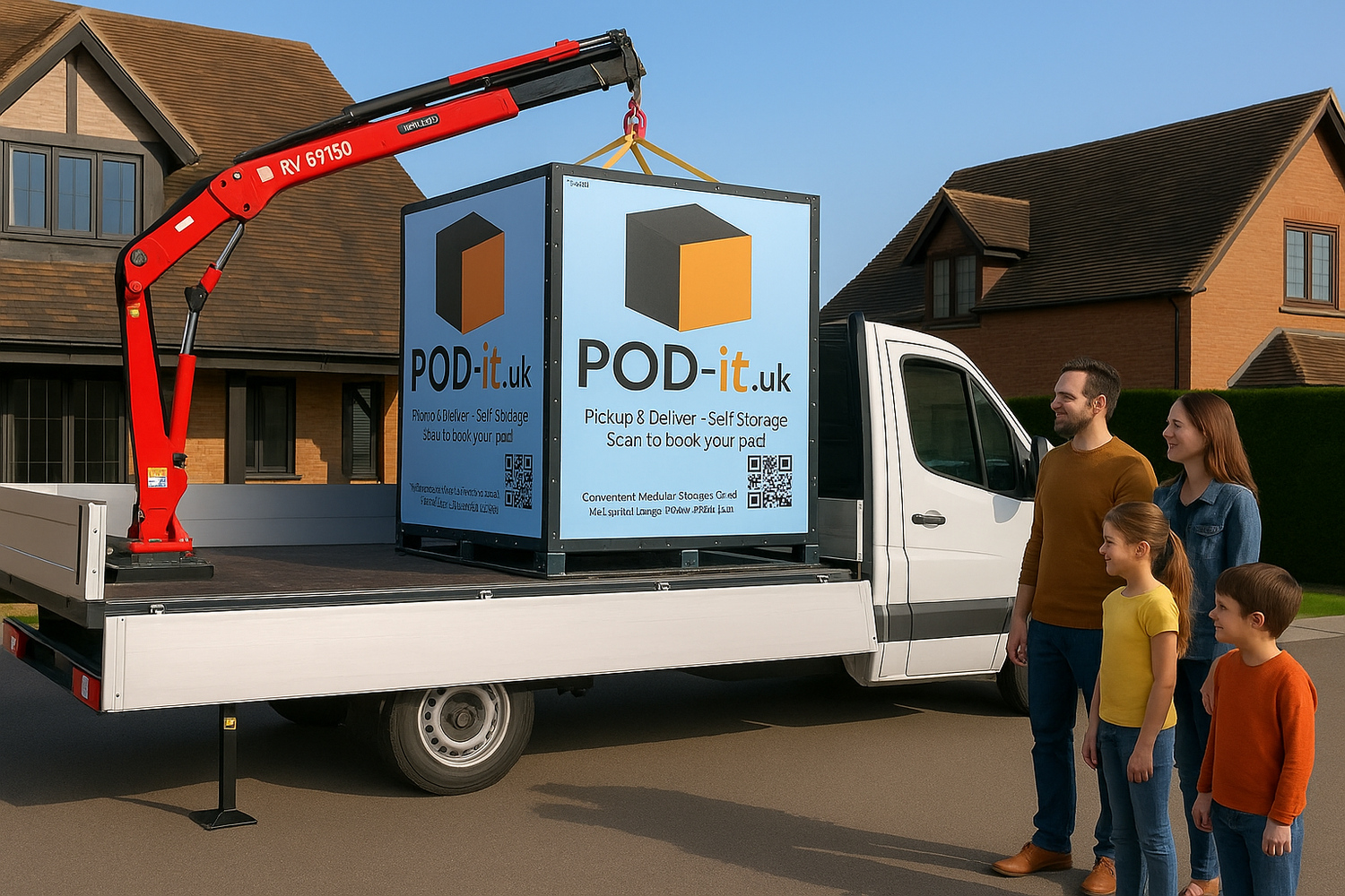 A secure, weatherproof storage pod is delivered to your home or site.You pack at your pace